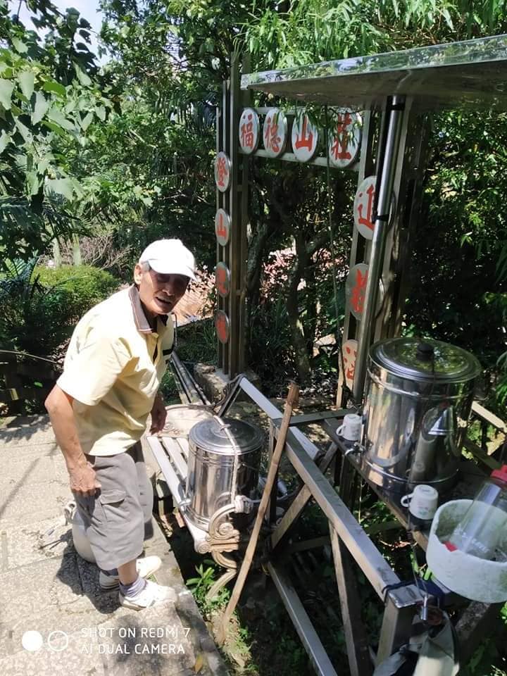 位於台北市四獸山虎山頂路上( 福德山莊),85 歲江老先生 用山林檢來的枯木,燒起數鍋的開水,置於峰頂路旁的奉水桶有二大桶,問阿伯說一天煮多少水? 阿伯回說沒有就補水,上下午各一回,15年的堅持另人感動,往來山友爬上高山,口乾舌燥之際,阿伯之水如荒漠甘霖,讓人感謝再感謝,低調默默做了15年,那回有經過福德山莊,記得跟他說聲感謝,不知道還能喝幾年了? 也謝謝 這些年九五峰揹水隊( 疫情暫緩)假日於峯頂的奉茶!備註:由於疫情,江老先生燒柴煮水畫面為2020 年7 月拍攝