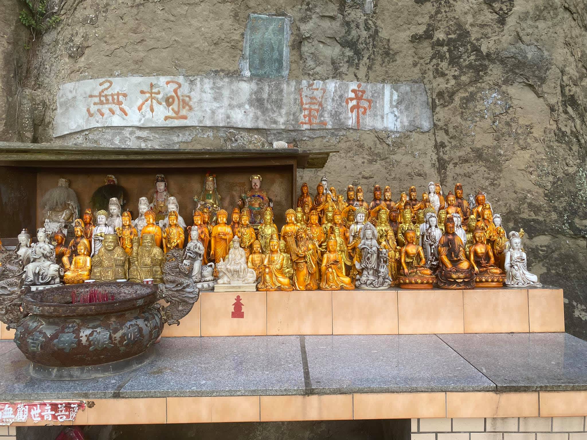 拇指山頂大石頭的正下方,一處聳立的峭壁下,有放著許多尊落難神明,幾年前還沒有那麼多,這幾年突然暴增出來好幾十尊,人類可能因為種種原因,無法繼續供奉這些 神明,也不知道該怎麼處理,可能就這樣擺放上來吧。