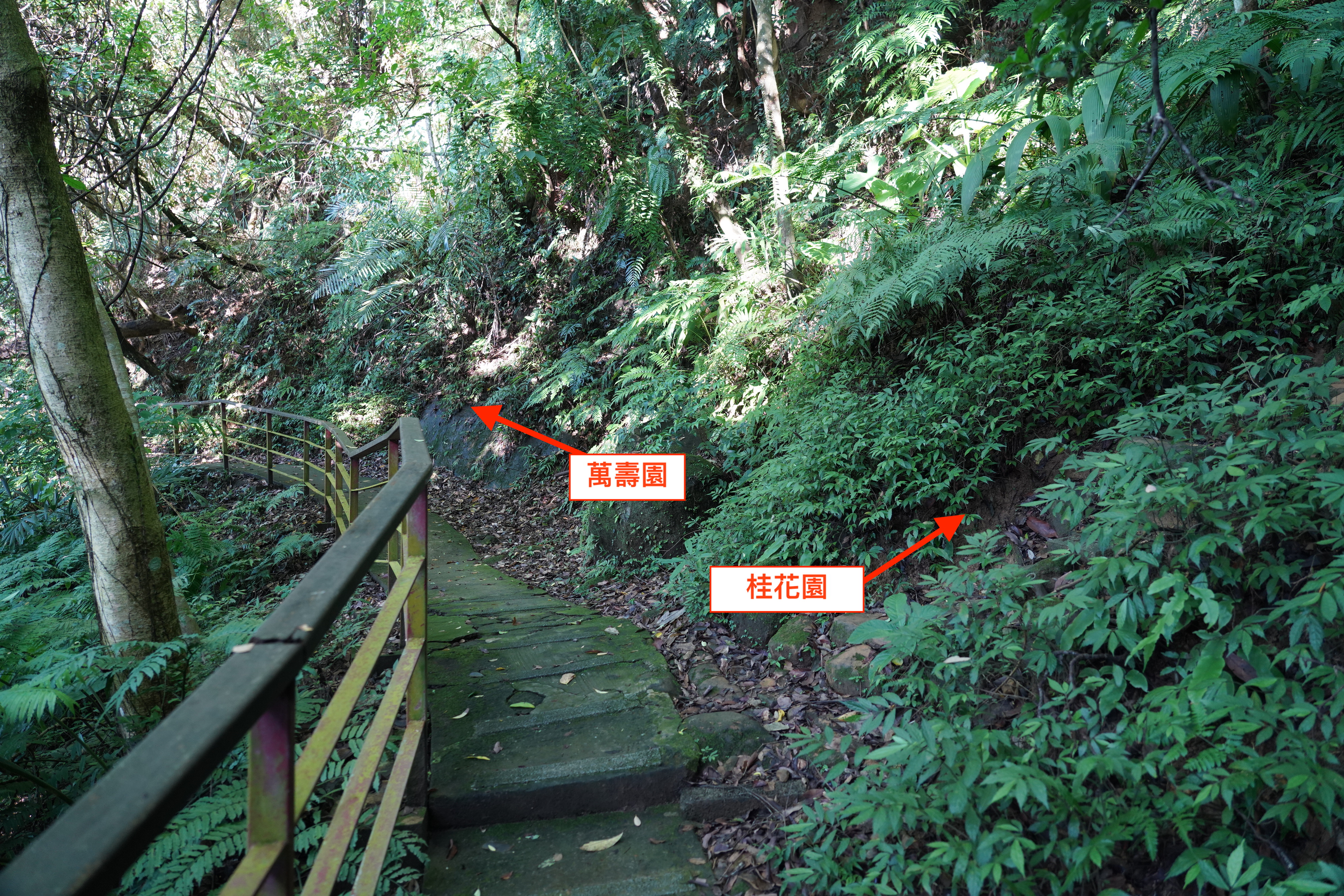 從這往上到萬壽園,大約二分鐘之內可到,過了萬壽園後,就是峭壁了,請注意安全