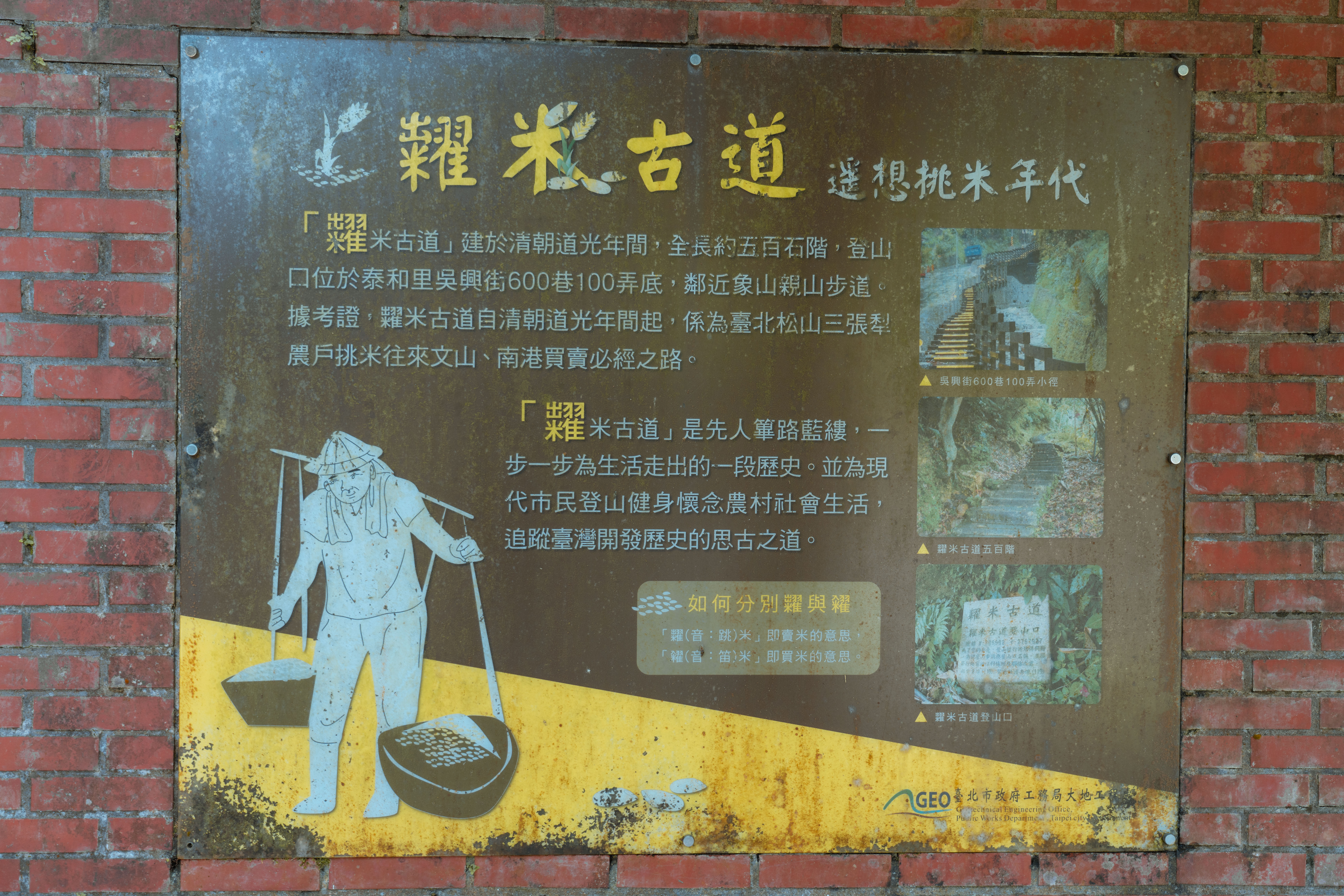 糶(音同跳)米古道登山口位於吳興街底600巷100弄,早期因為開採煤礦而設置輕便鐵軌,一直鋪設至吳興街口的位置,吳興街那時候都是農地,後來吳興街才慢慢地發展起來。
