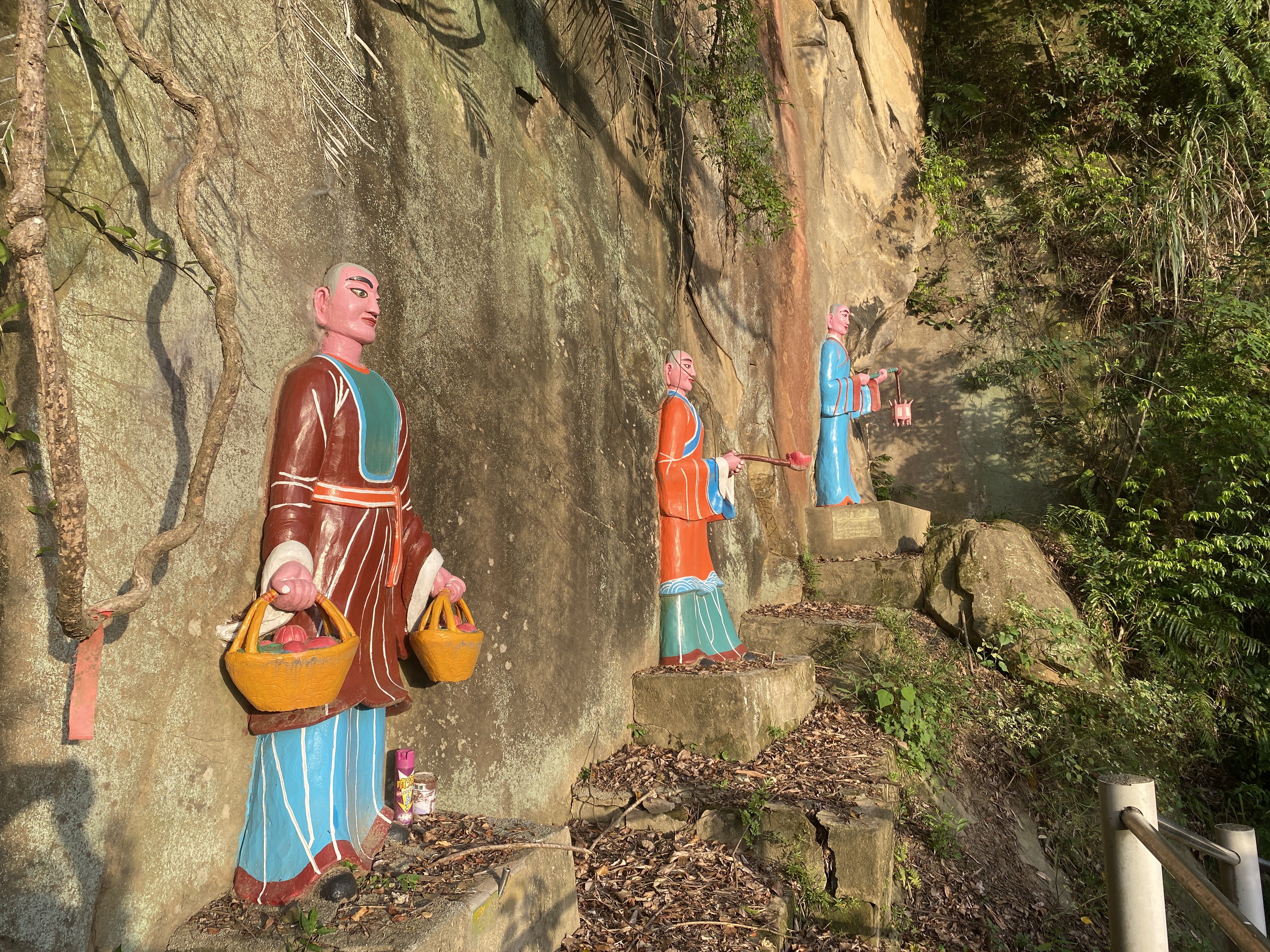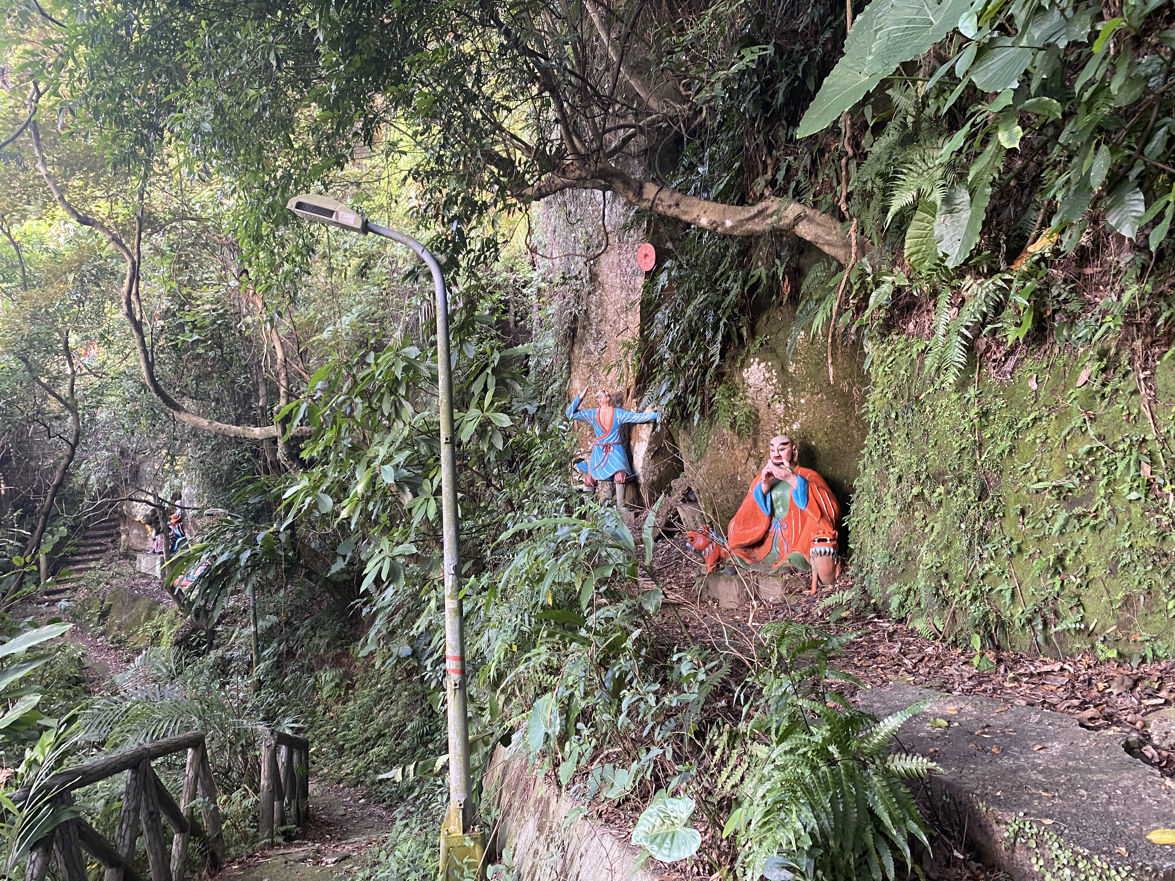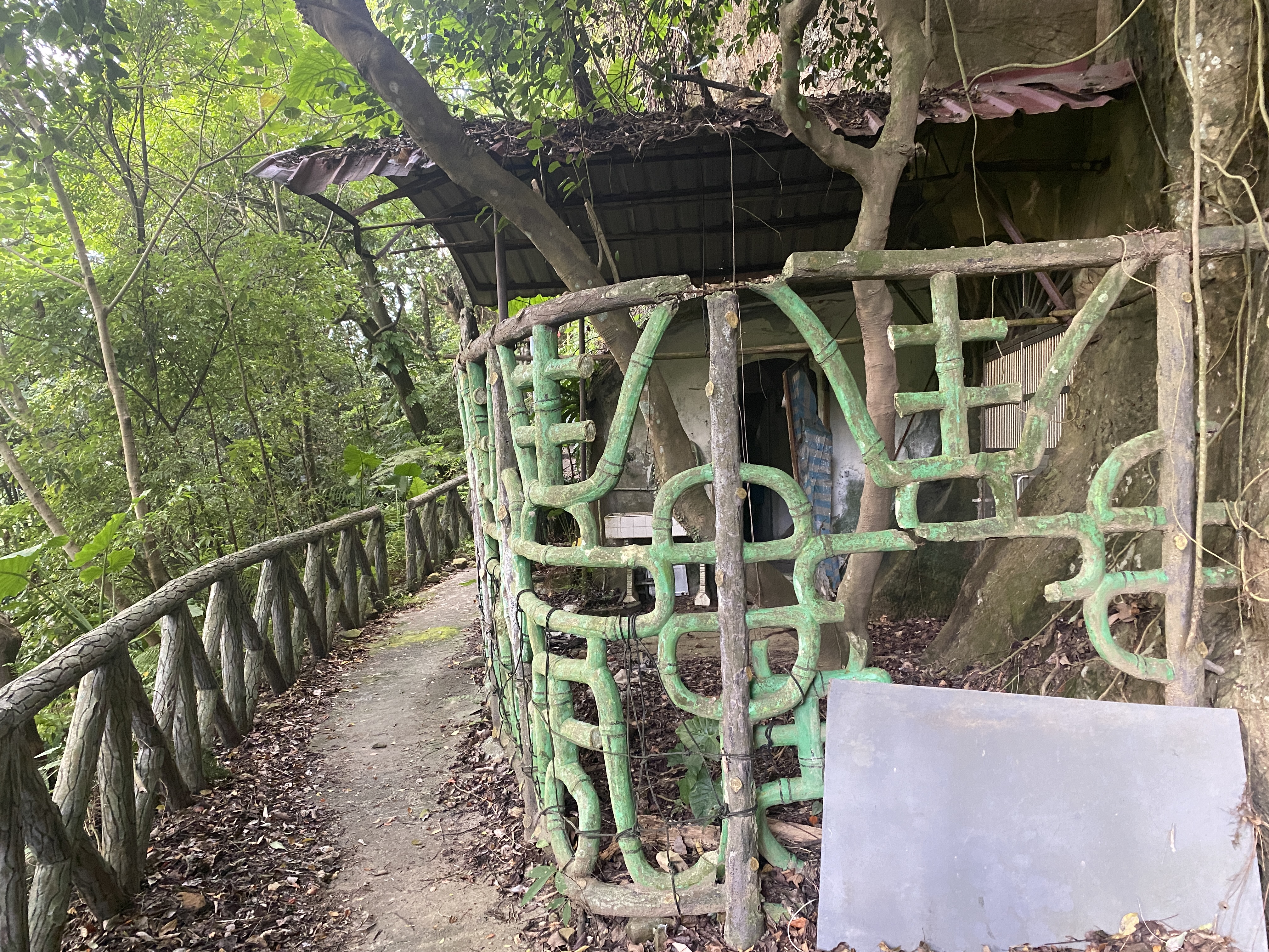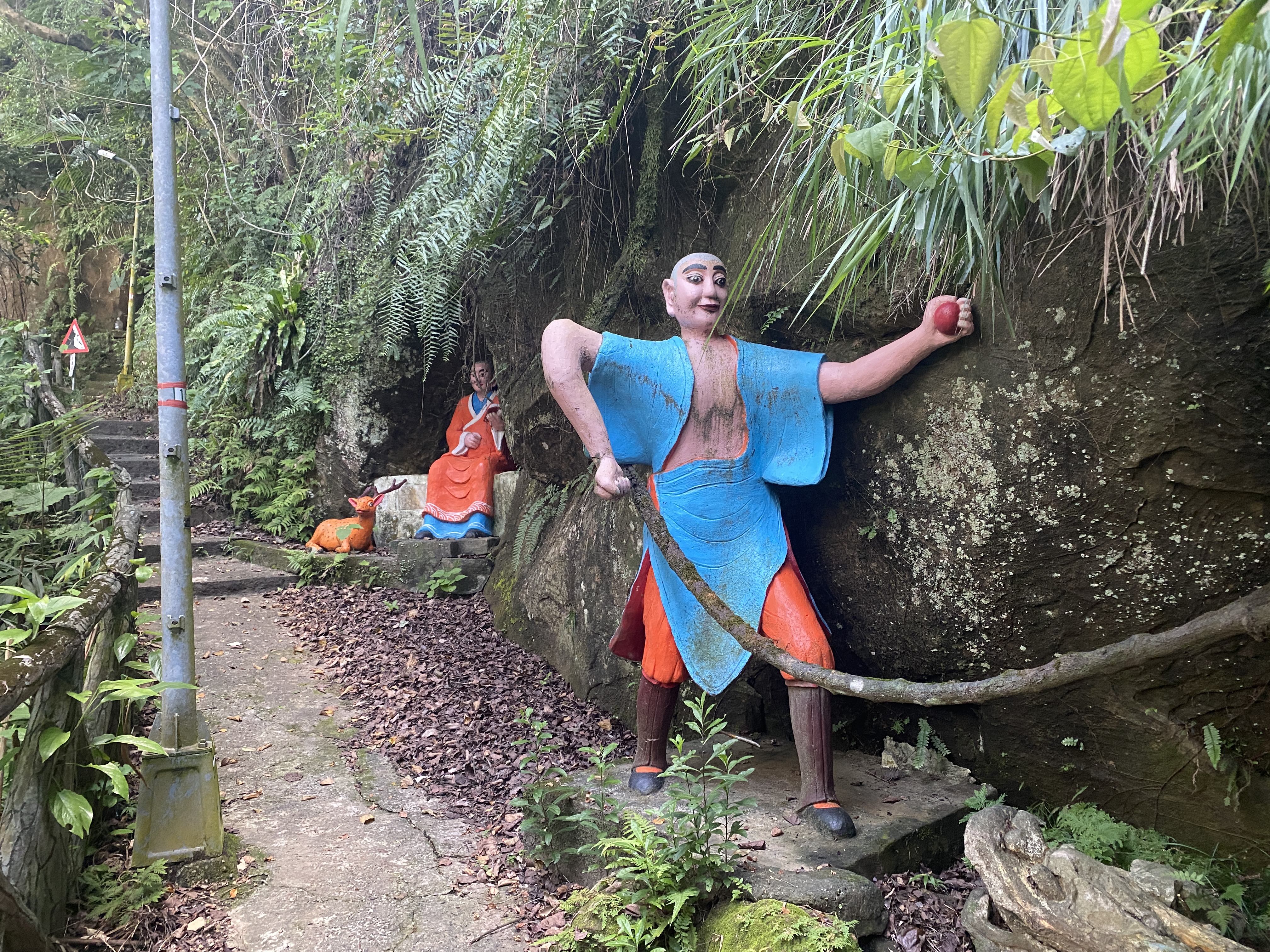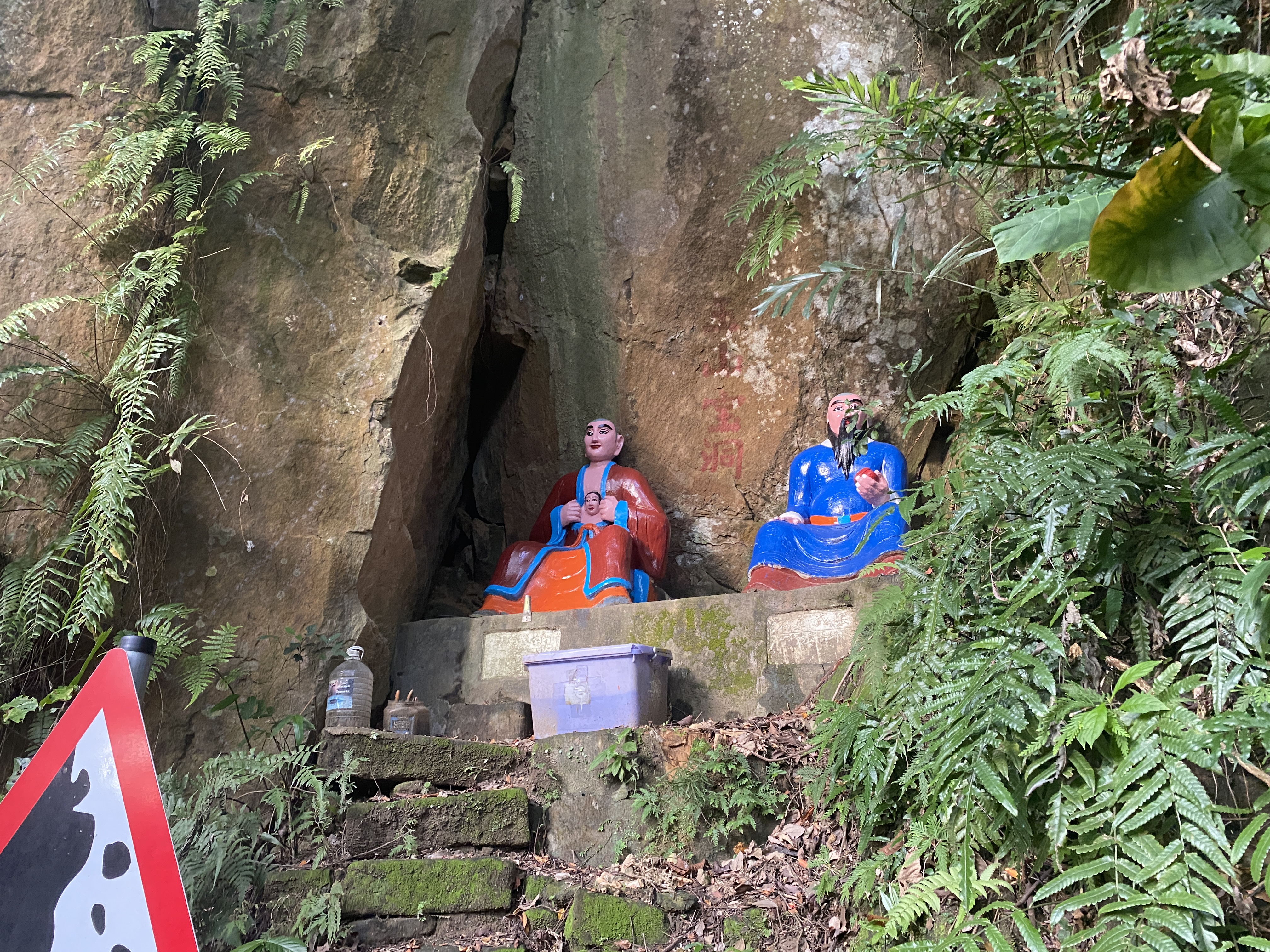 面對天寶聖道宮的左邊,有一條橫向的山徑,已經沒什麼人在走,這裡可 以看到許多色彩繽紛的雕像,還有一個門口有鐵門的洞窟,聽說是以前廟方的師傅在閉關用的,這條小徑沒人打掃,樹葉蜘蛛網都很多,但是這條一直走下去,可以通往豹山溪步道。