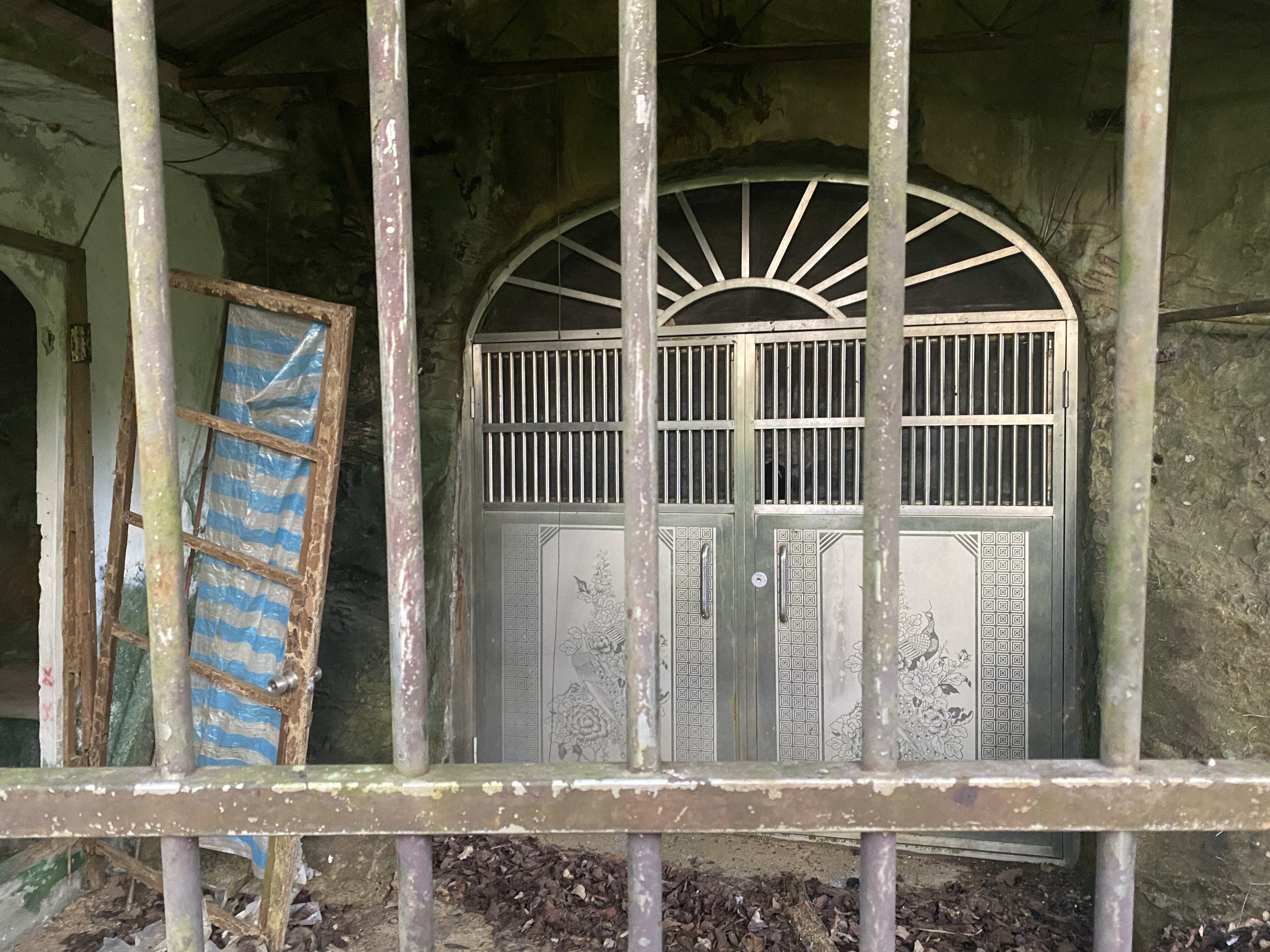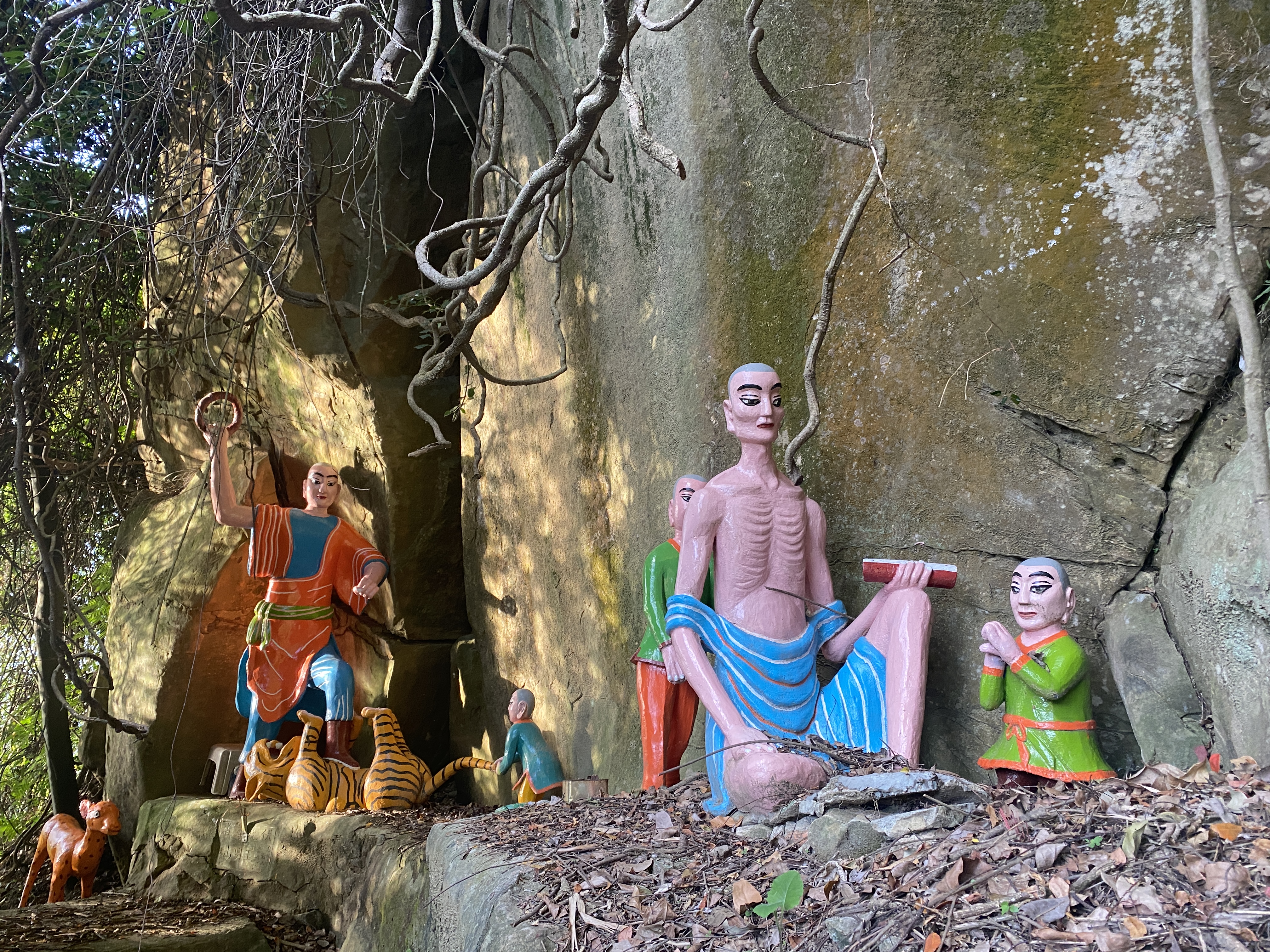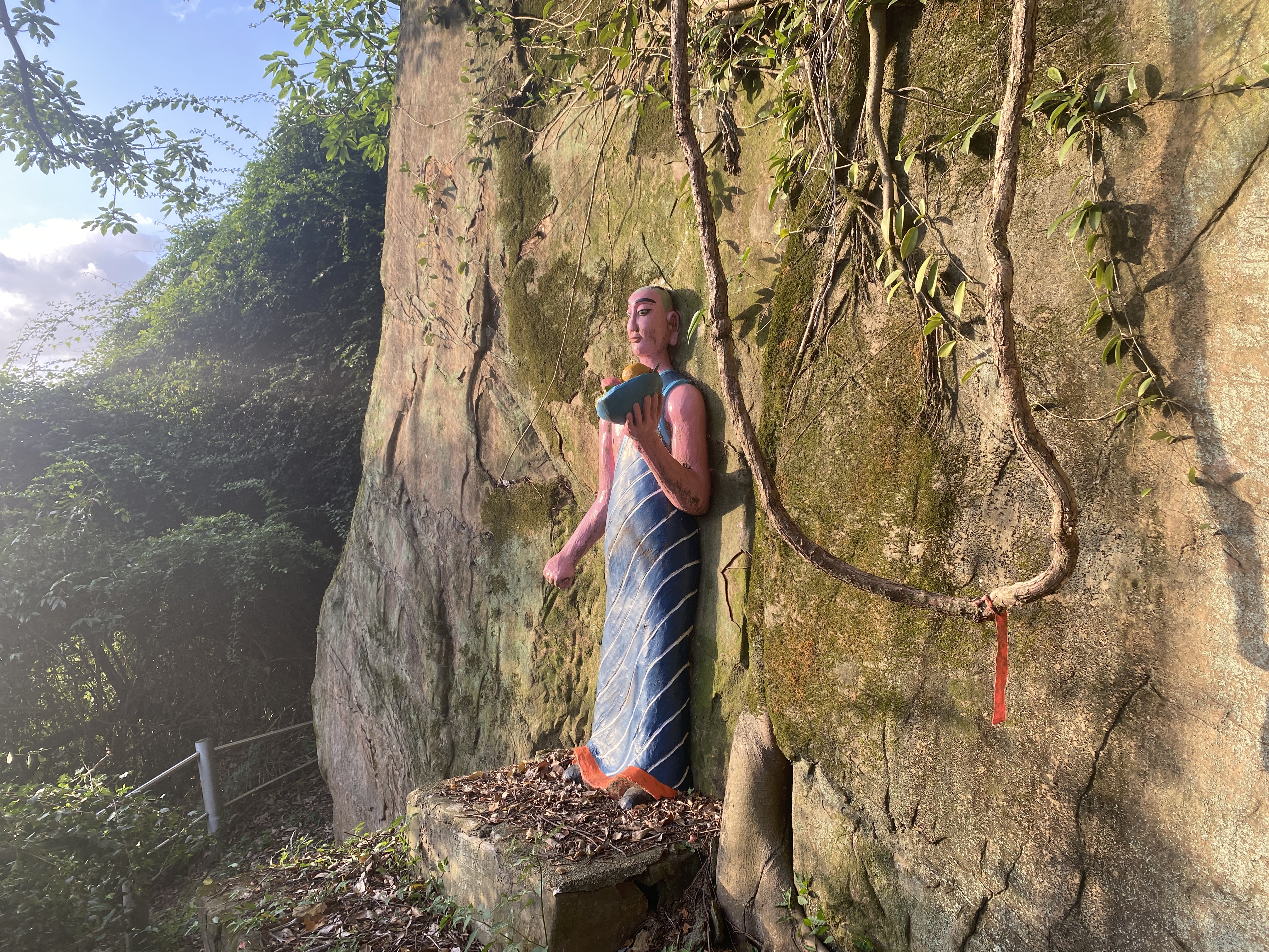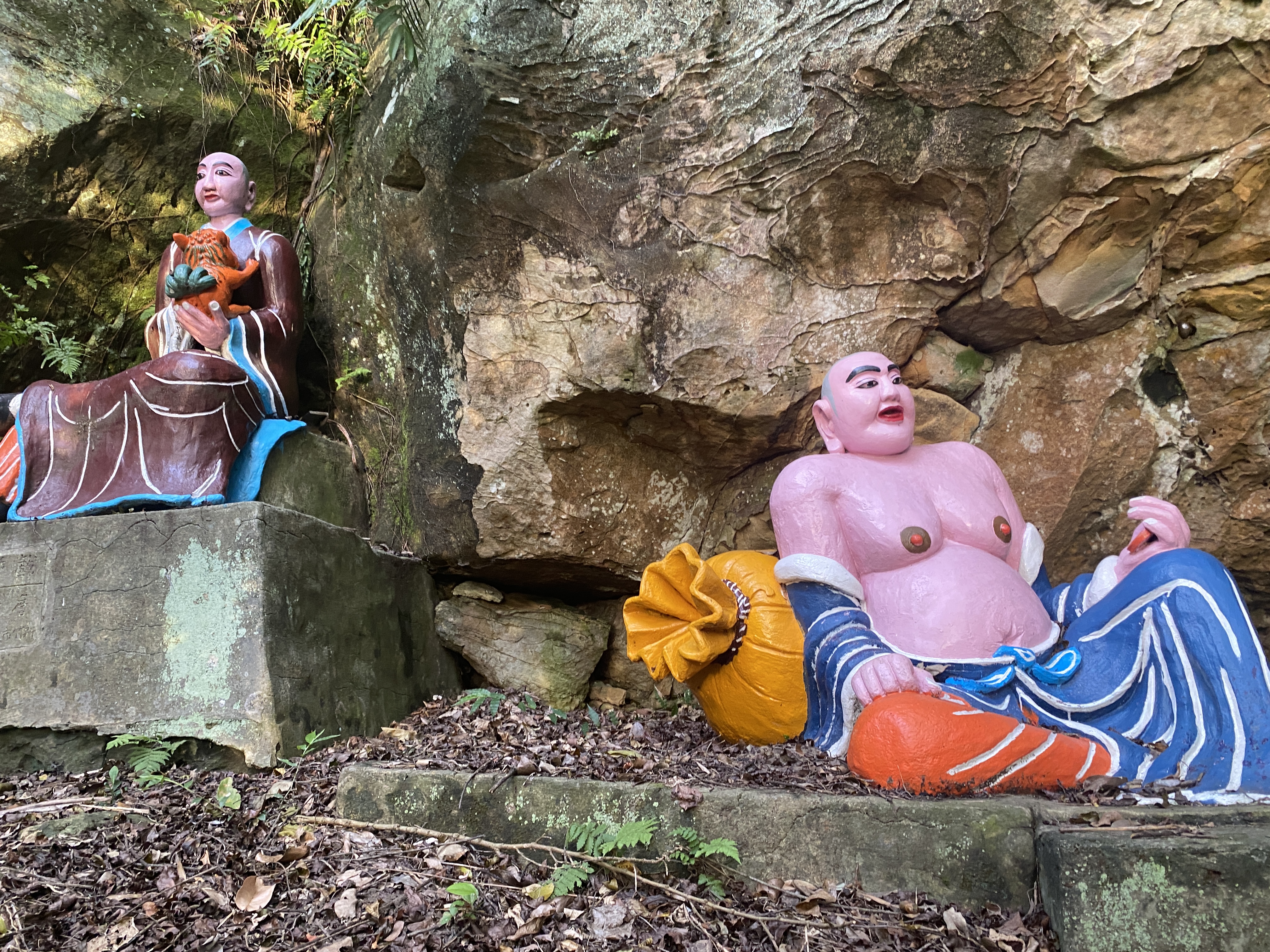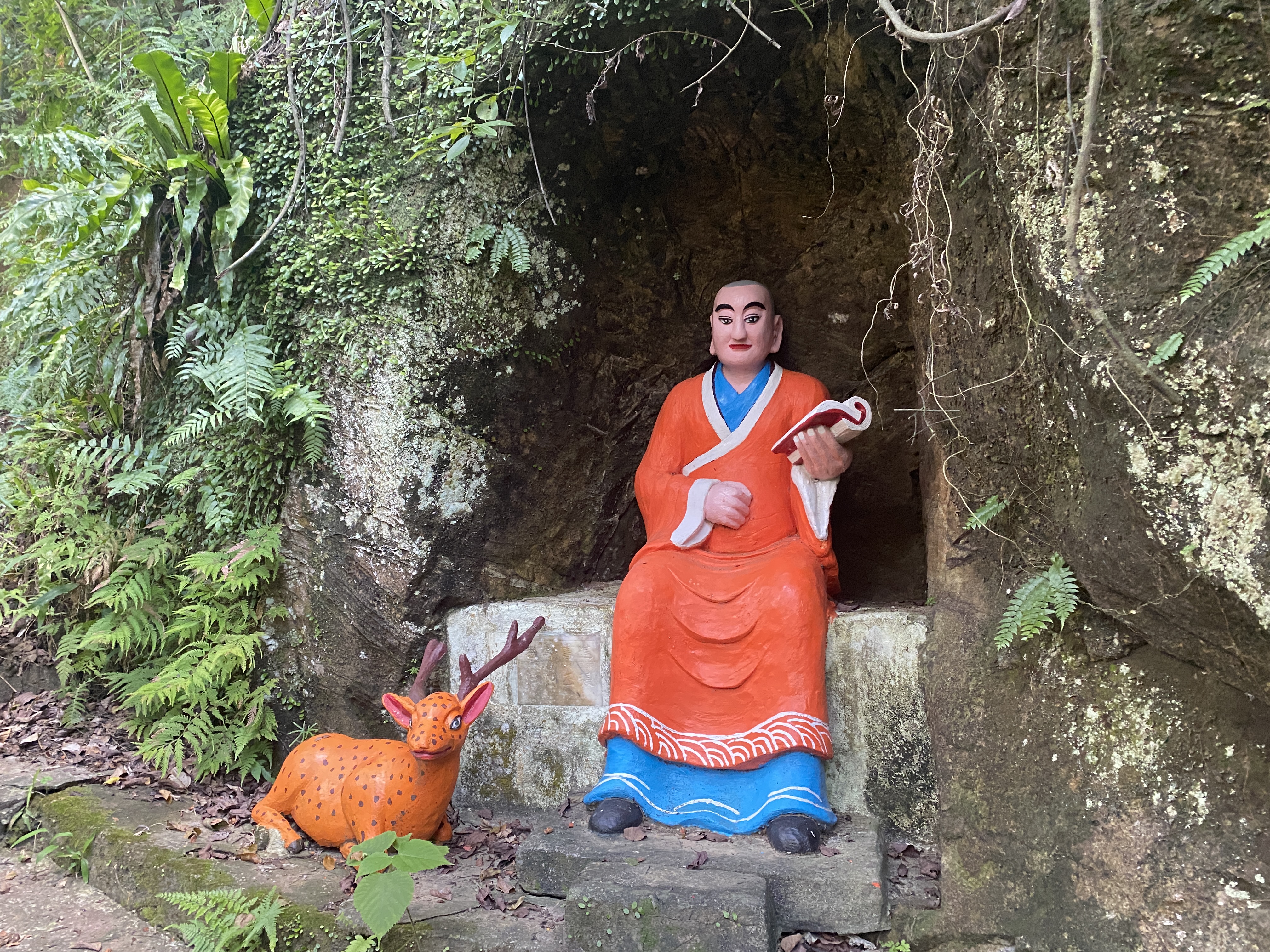 面對天寶聖道宮的左邊,有一條橫向的山徑,已經沒什麼人在走,這裡可 以看到許多色彩繽紛的雕像,還有一個門口有鐵門的洞窟,聽說是以前廟方的師傅在閉關用的,這條小徑沒人打掃,樹葉蜘蛛網都很多,但是這條一直走下去,可以通往豹山溪步道。