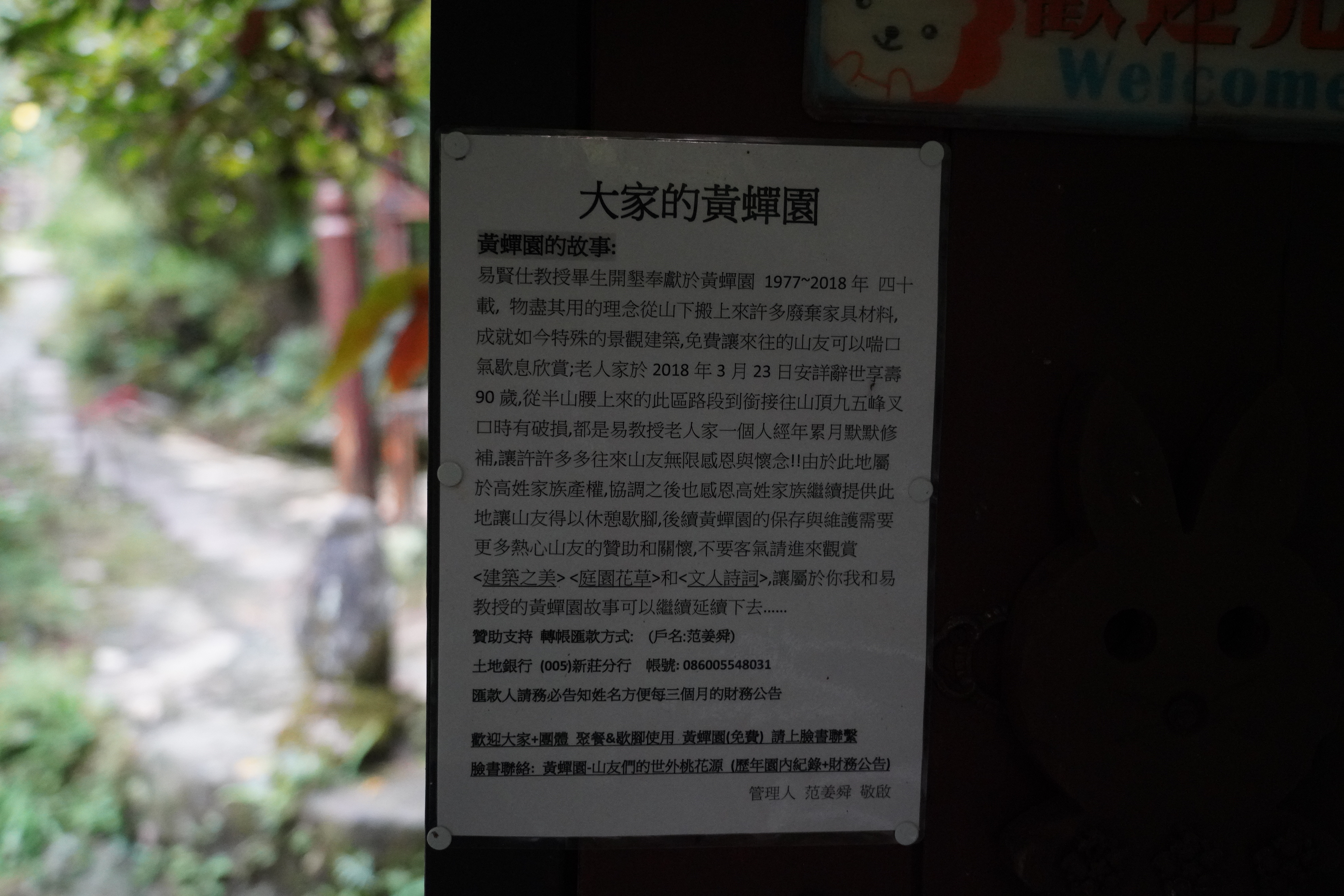 山上總是有許多人都是非常的熱心,已故的易教授也是如此,從很久以前就耳聞虎山有個黃蟬園,裡面有個人都從山下獨自搬運廢棄的建材上山再利用,有走過虎山古道的就知道這段有多陡峭,更何況是年紀大的長輩 搬運建材上山,這段佳話必須繼續流傳下去,所以我特地的從黃蟬園旁下山,來拜訪一下老先生的花園。